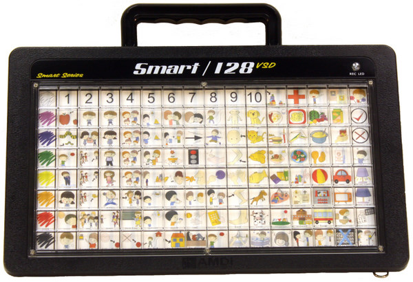 Smart/128Smart/128 Multi level communication device. With interchangeable keyguards and visual scene capabilities.The Smart/128 communicator features a transparent top grid that can be easily removed. With the grid, the Smart/128 is a standard static 128 location AAC device. Without the grid, the Smart/128 can be used as a pictorial communication device. This key feature with the removable flash memory card and overlay recognition brings an added level of versatility to our new device. Smart Series features: Smart Overlay System Interchangeable FLASH card Slimmer housing design Carrying handle The Smart Series is manufactured to the highest commercial standards to provide many years of reliable performance. |
